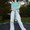 A loose, straight leg with extra length to stack at the ankle in a super high rise.